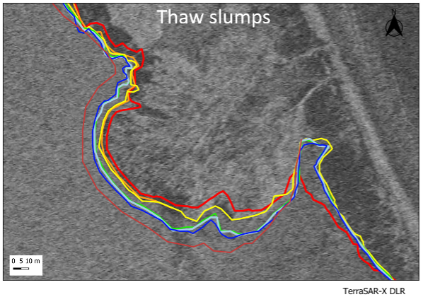 Monitoring a retrogressive landslide scar in the Canadian Arctic using images from the TerraSAR-X (DLR) microwave satellite, which allows observation even in cloudy sky conditions. © DR