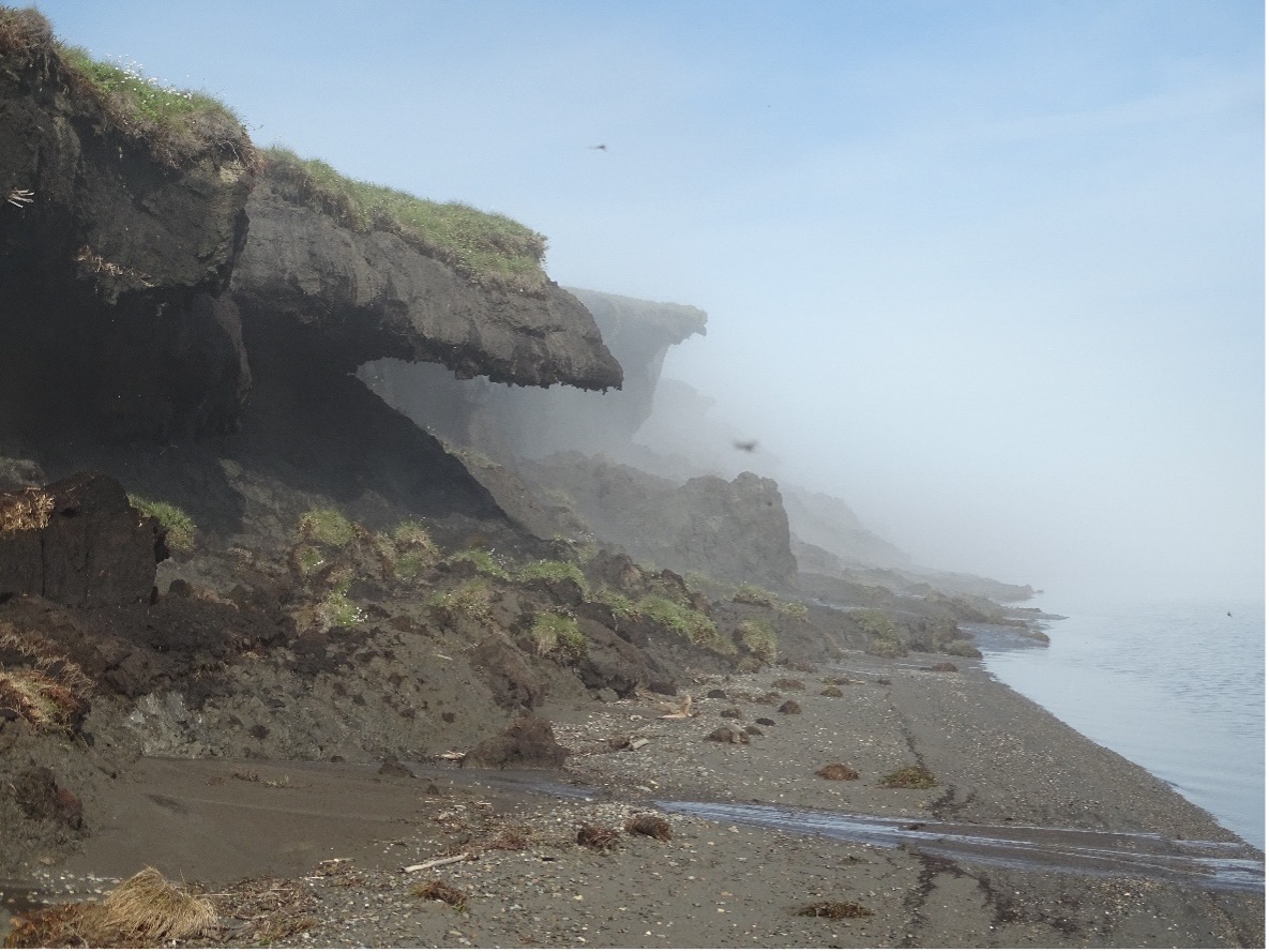 Cliff carved out of permafrost in the Canadian Arctic, where annual erosion of several metres leads to the transfer of organic matter from the permafrost to the atmosphere and ocean. © DR