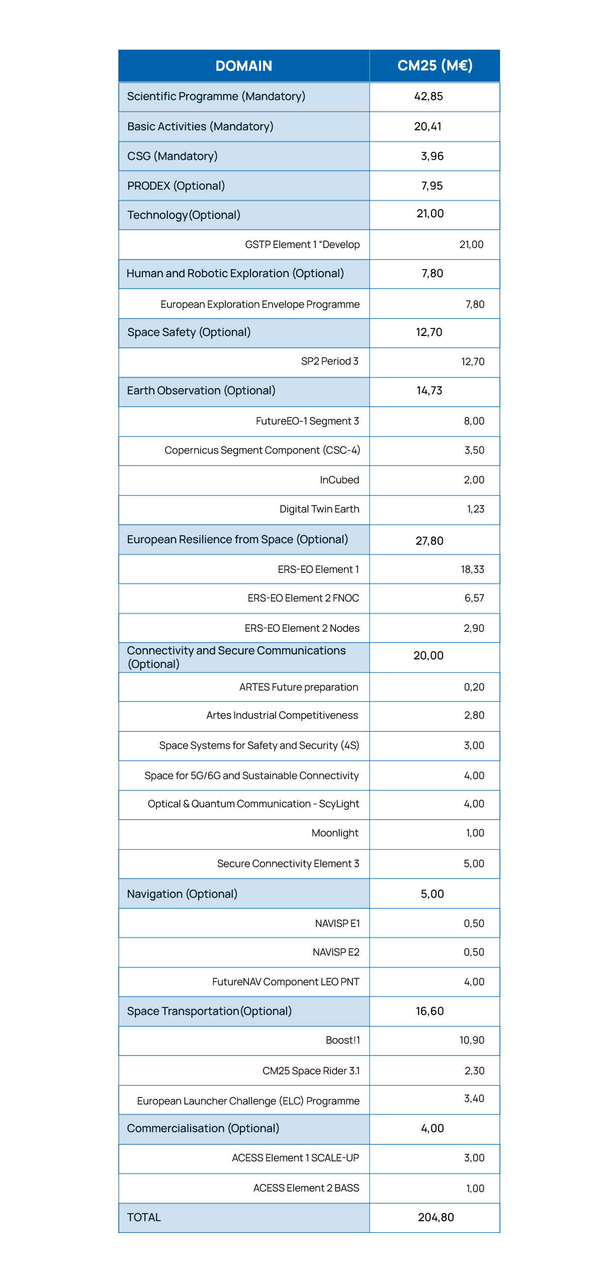 No decorrer da ministerial, os altos representantes dos 23 Estados-Membros, Estados Associados e Estados Cooperantes da ESA confirmaram o apoio a programas de ciência, exploração e tecnologia, bem como um aumento significativo do orçamento dos programas de aplicações da ESA – observação da Terra, navegação e telecomunicações –, que passam a ter um peso reforçado enquanto pilares da iniciativa European Resilience from Space (ERS), a resposta conjunta europeia a necessidades críticas de segurança e resiliência. “Esta é uma grande conquista para a Europa e um momento muito importante para a nossa autonomia e liderança em ciência e inovação”, afirmou o diretor-geral da ESA, Josef Aschbacher, sublinhando que o pacote agora aprovado representa “um aumento de 32% das contribuições, ou 17% em termos reais, face ao Conselho Ministerial de 2022”.
