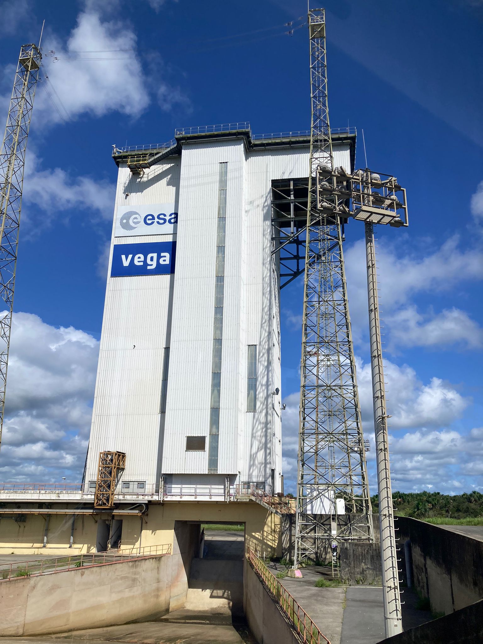 The Vega-C building, inside of which the rocket was integrated and ready for launch. Three hours before liftoff, the whole building would be moved away. © Manuel Wilhelm/ DR