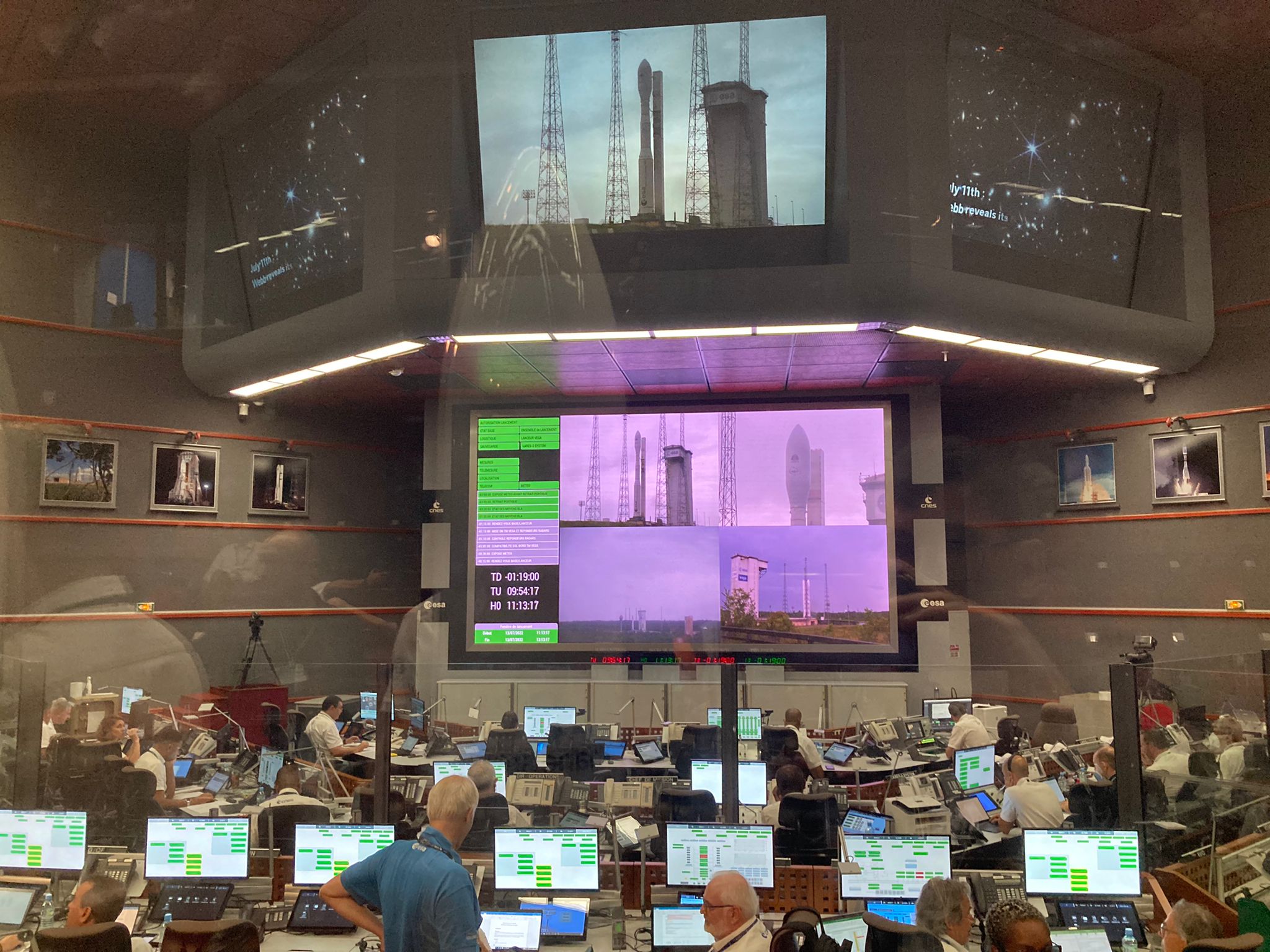 It’s 7:00 now, we arrived at the space center, and it is time to go to the Jupiter Room. This is where the Mission Control team is seated, separated by a glass wall from the visitors, the so-called “fish-bowl”. Looking outside at the sky, one can only hope that the clouds will dissipate so everyone can have a clear view of the launch.